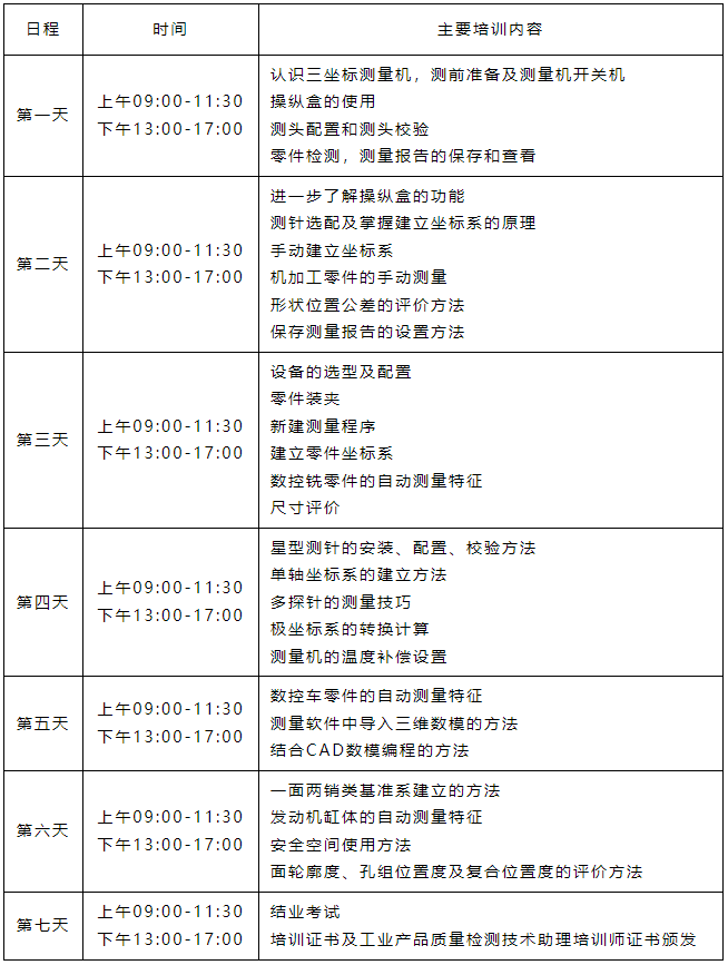 围绕精密检测技术等相关工作岗位与工作任务,通过任务驱动、案例分析、实际操作等多种培训方式,以真实项目案例为载体,基于工学一体化的教学理念,全方位培训现代精密检测技术,同时穿插讲解精密检测技术、智能制造技术发展新方向、新动态。培训内容主要包含了解三坐标测量技术理论知识及操作规范;掌握坐标系种类、建立方法以及如何建立检测零件的坐标系;掌握常规几何特征手动检测、线性尺寸及形位公差的评定;掌握数控车类、铣类零件的编程方法与技巧;掌握高级程序编写技巧及复杂工件的编程练习和检测。