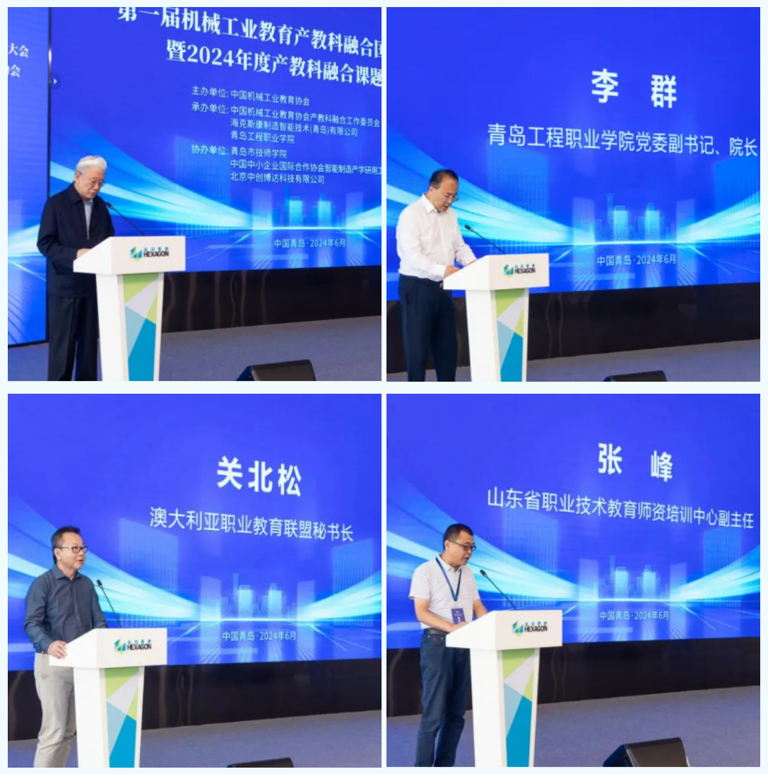 中国机械工业教育协会会长王守法(左上),青岛工程职业学院党委副书记、院长李群(右上),澳大利亚职业教育联盟秘书长关北松(左下),山东省职业技术教育师资培训中心副主任张峰(右下)等来自协会、院校和教育联盟的领导嘉宾为大会致辞,并强调了产教科融合工作的重要性,为产教科融合工作提出了宝贵建议。