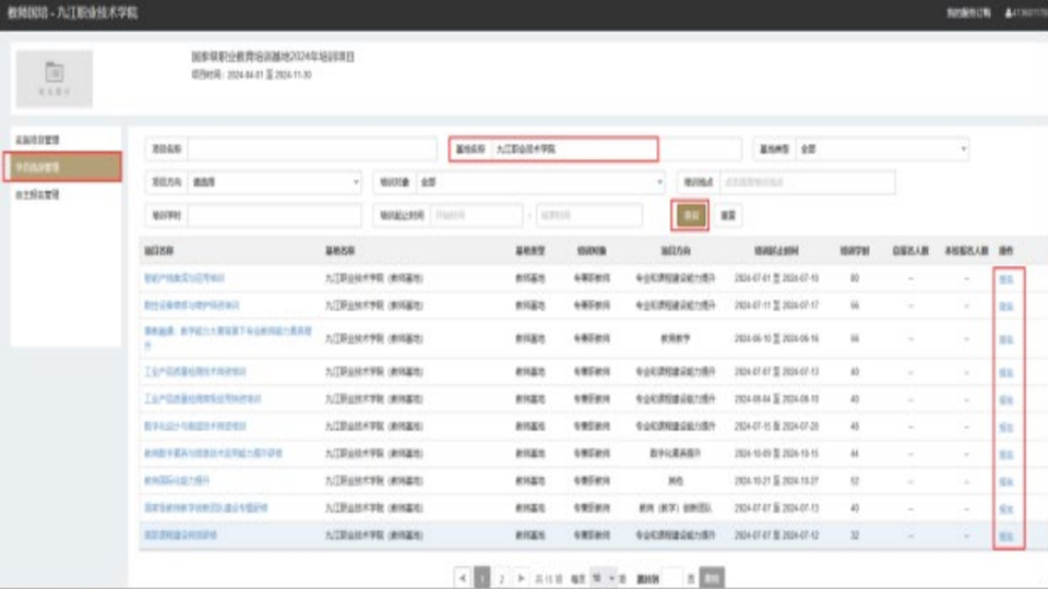 第五步:点击左侧“学员选派管理”,在基地名称中输入“九江职业技术学院”,点击“查询”,点击对应培训项目右侧“报名”,进入报名页面。