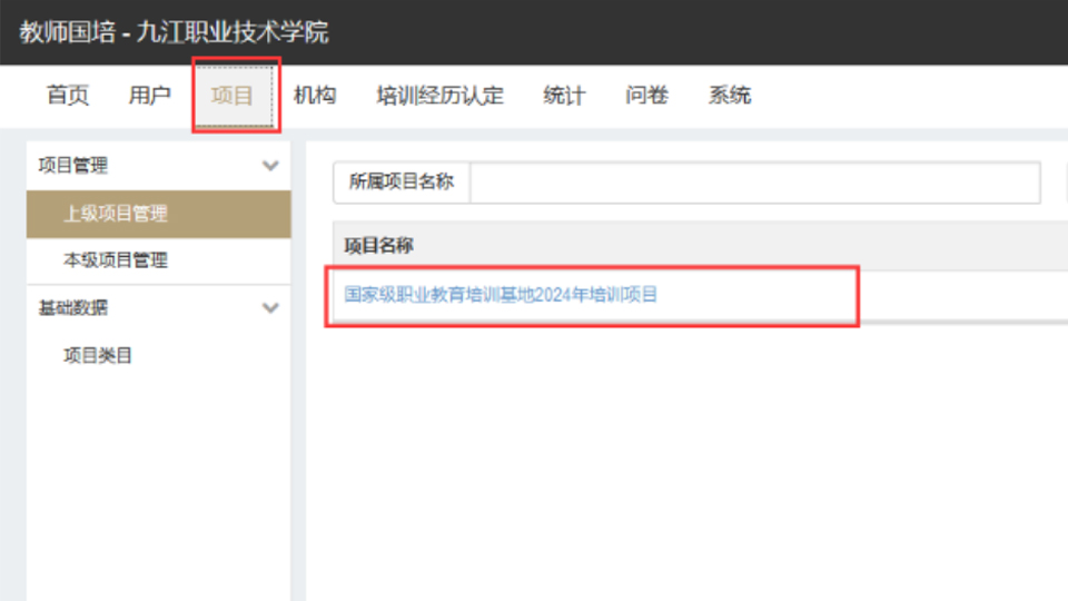 第四步:进入“项目页面”点击“国家级职业教育培训基地 2024 项目”。