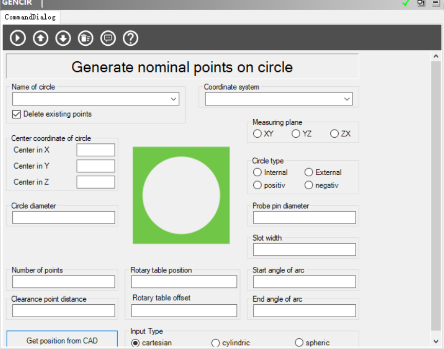 6、生成元素测量点——生成直线(GENAXI) 、生成平面(GENPLA)、生成圆(GENCIR)、生成圆柱(GENCYL)、生成圆锥(GENCON)、生成球体(GENSPH)、生成扫描线(GENSCAAXI)、生成扫描圆(GENSCACIR)、生成多探针安全点(GENCLP)、生成螺旋点(SCREWNPT)、沿圆柱面旋转点(ADJCYL)、循环(DO / ENDDO)、、目标转换(TRAOBJ)、不同坐标系下的元素转换(TRAELE) 、设置逼近和回退距离(SETCMPAR)