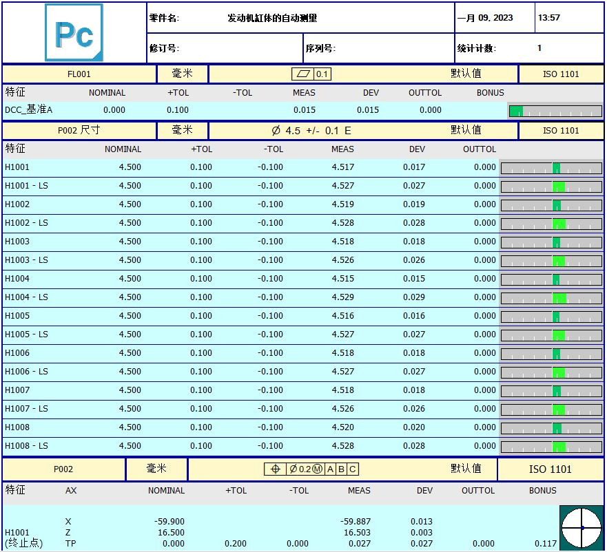 6、出具检测报告,PC-DMIS具有强大的报告功能,仅文本格式、文本与CAD格式、仅CAD格式、图形分析格式、仅CAD横向格式、PPAP格式、无格式模板、文本与CAD超差格式、形状图格式、默认格式;