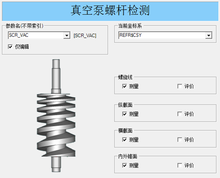 软件包同时适用于等径等距、等径变距及变径变距的螺杆工件类型,基于转台自动生成四轴联动扫描路径。软件方案以参数化界面的形式引导客户输入对应图纸的工件参数,自动生成测量路径,对测量结果进行评价并输出直观的测量报告。