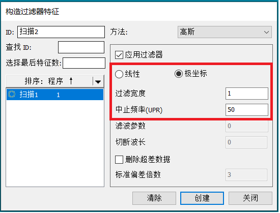 然后,考虑到此处使用的圆形扫描,在进行数据过滤时,选择极坐标的过滤选项,并且选择了高斯滤波的方法,实现在工作平面内的径向上进行过滤,并且首尾相连,所有数据都可计算。