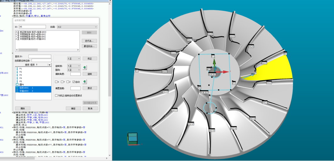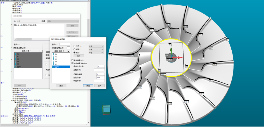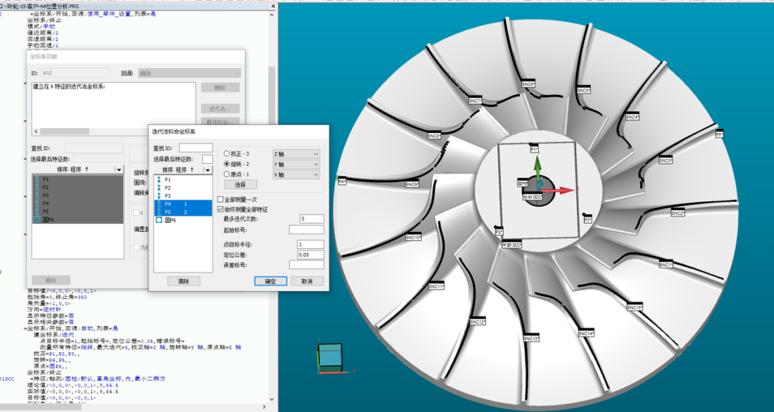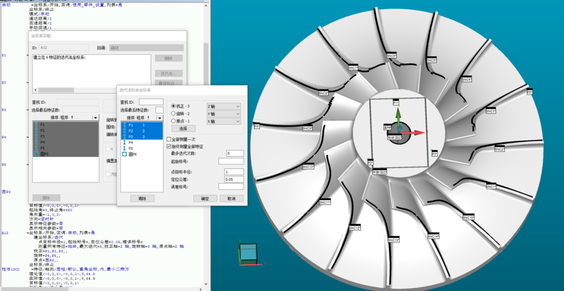 1)迭代法粗建立坐标系,面上3点找正,侧面两点定旋转,中间孔圆取样例点定原点。