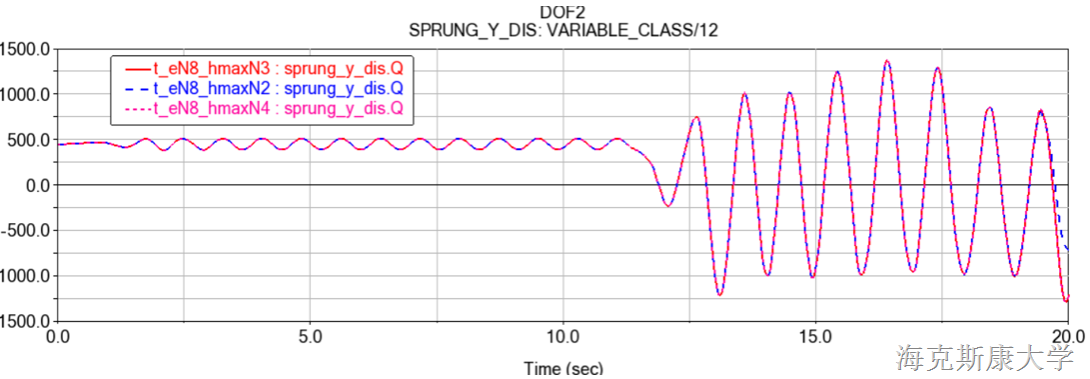 研究error设置:将Hmax设置为1e-3,分别设置error=1e-10,error=1e-9,error=1e-8,error=1e-7。查看sprung的位移响应,可知当error为1e-7时,与其他结果差异较大,其他响应曲线也是。因此可先将误差设置为1e-8。