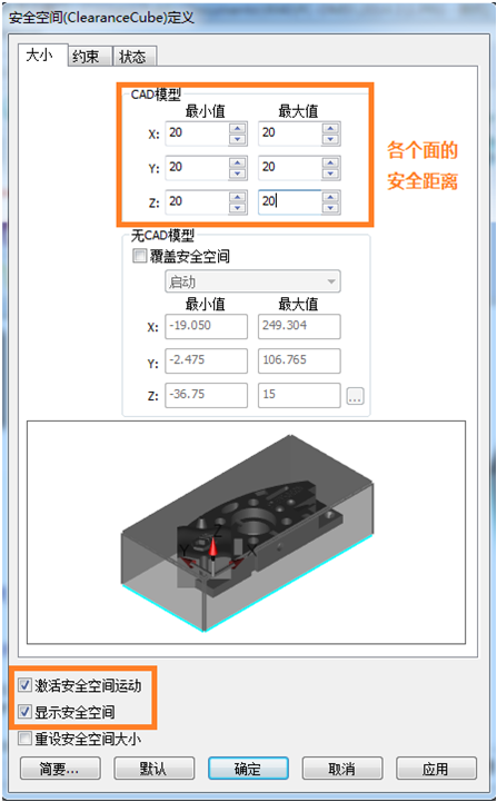 定义各个面的安全距离,勾选“显示安全空间复选框”,在图形显示窗口可以看到安全空间大小