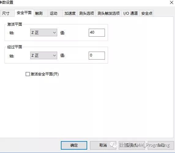 对于测量特征都在+Z工作平面的时候,我们设置安全平面很方便,只要设置一个激活平面,不用设置下面的经过平面。当我们工作平面转换的时候,我们就会用到下面的经过平面或者用安全点或安全空间来避免探针碰撞。