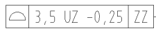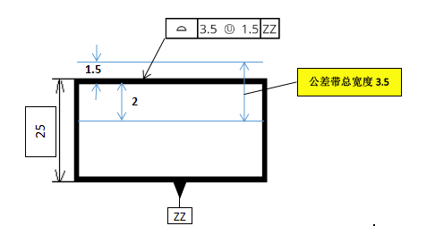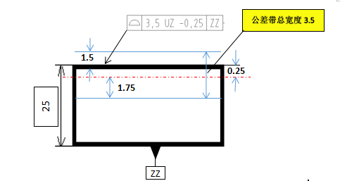 上图欧标不对称面轮廓度总公差带3.5mm,UZ后面-0.25表示公差带中心向材料里偏移0.25mm,中心找到后3.5公差对称分布±1.75,具体见下图: