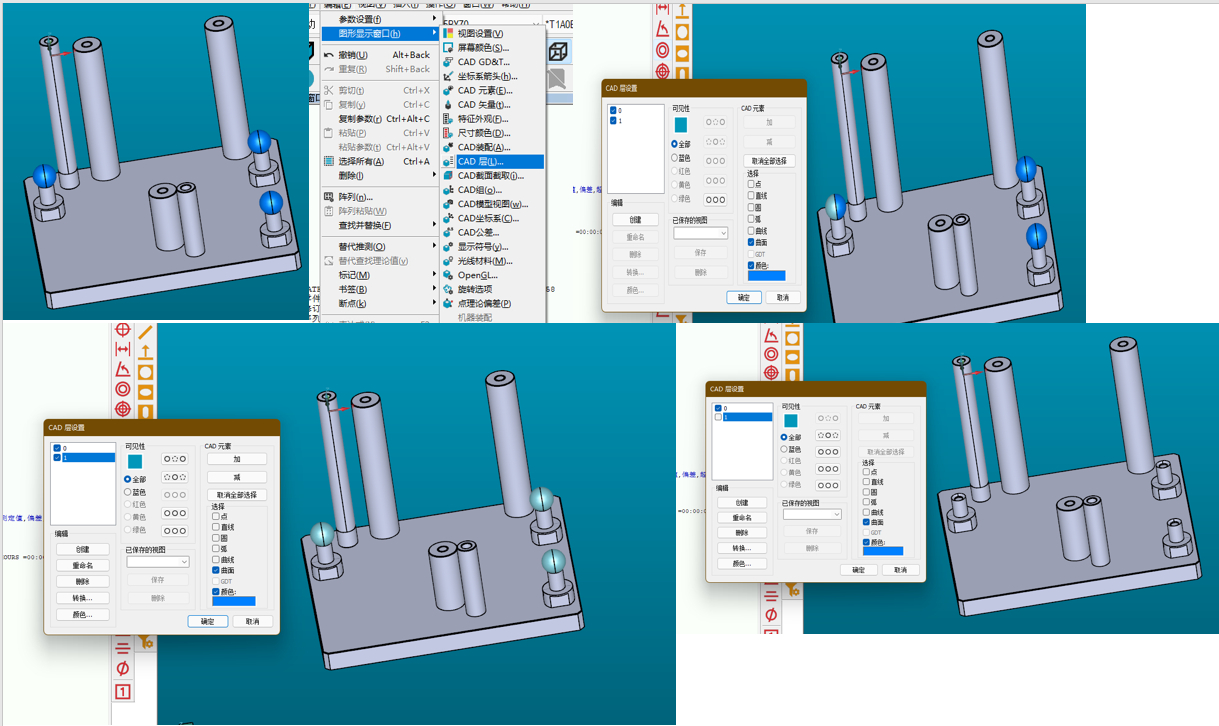 如果遇到CAD一体同类型部件不同上色的CAD时,可以用cad层的功能选中同一种颜色的部件进行操作。