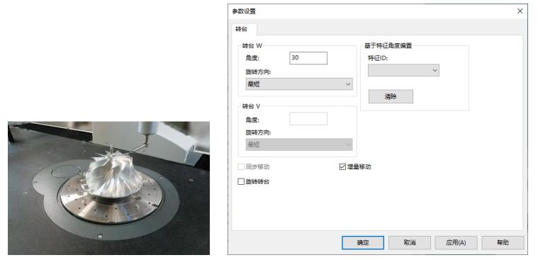 使用转台可有效减少测座旋转角度或配置测针的数量,PC-DMIS 新增支持转台以增量方 式旋转某角度。