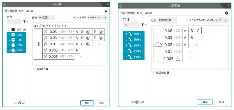 4. 扩展了复合位置度和复合轮廓度的特征控制框,最多支持5行复合特征控制框,显著改善评价易用性