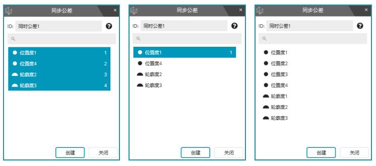 · 同时性评价对话框在选择第一个评价后,自动过滤同类项(相同基准顺序与实体条件要求的 尺寸)简化操作难度。