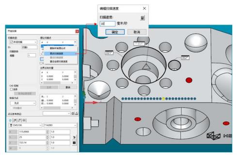 • 对于开线扫描、曲面扫描和周边扫描,可以在理论扫描点处设置不同扫描速度。激光测头扫描时越过 该点后以设定速度扫描。