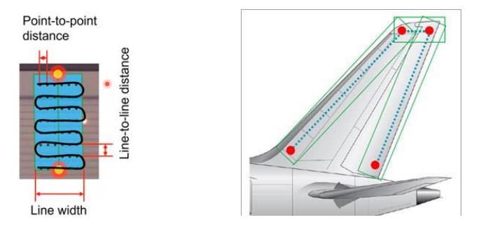 2. 直线扫描:该模式适应于测量边缘或者直线。如果激光跟踪仪正对于测量对象且只需要测量直线,就可以在全景 相机中画出扫描线并设置扫描线宽。 光束会按照最快的路径扫描规划好的路径点(会有圆弧过度),而不是精确 地沿着设定好的路线移动。如果希望精确地沿着每条规划的线测量,需将先线宽设置为最小值(0.5mm)。