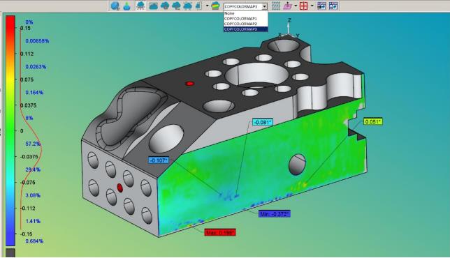 利用在“快速点云”和“点云”工具栏中的“曲面色差图”列表框,在图形显示窗口快速显示激活 的曲面色差图,带有注释和颜色尺。这是理想的色差图显示: