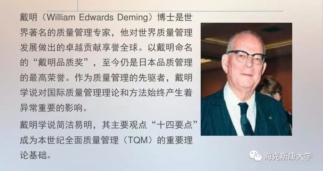如果你想要学习全面质量控制/管理(TQC/TQM),那你就先学习戴明管理方法,因为全面质量控制意味着用统计学和系统的方法去不断改进和解决问题,而这就是戴明管理哲学的理论基础。