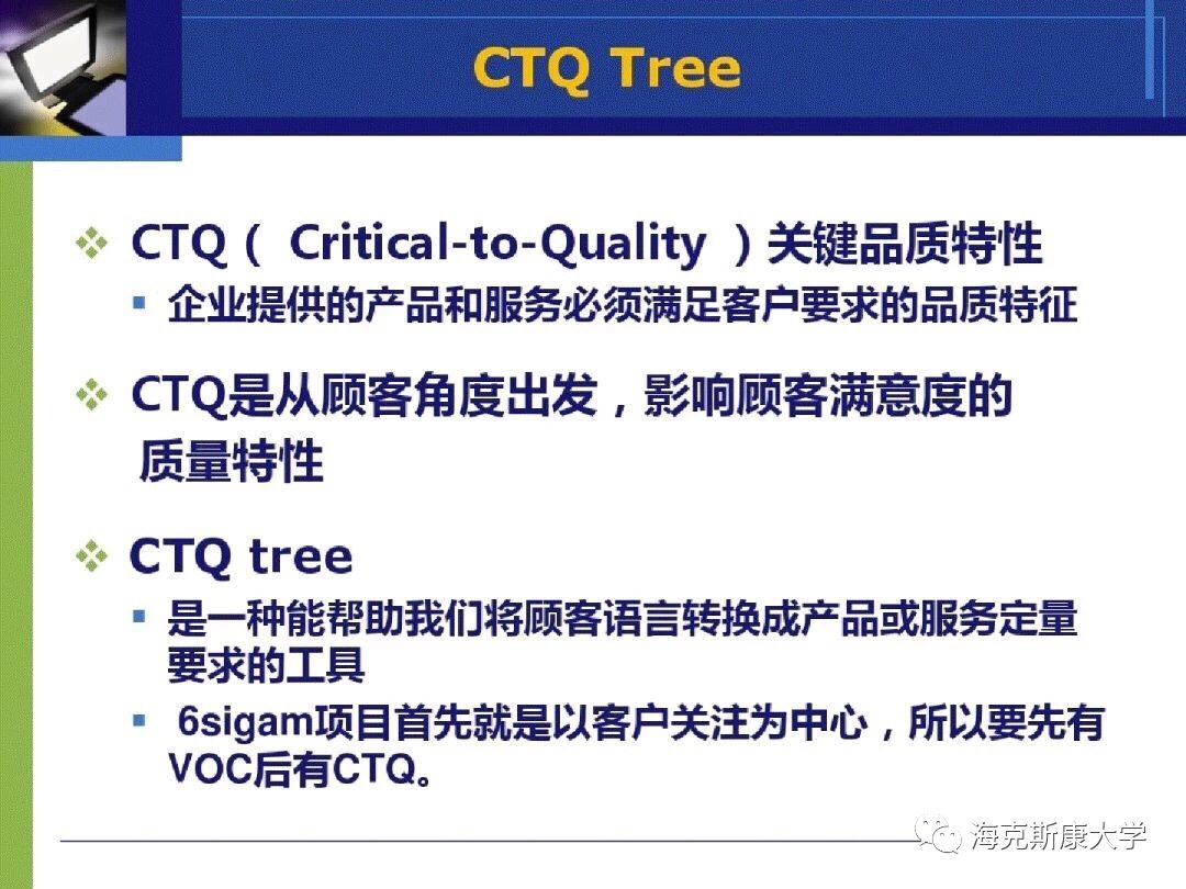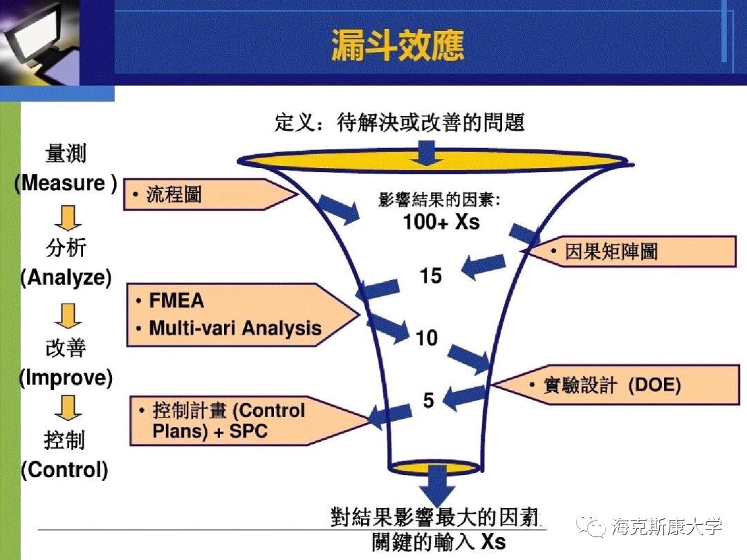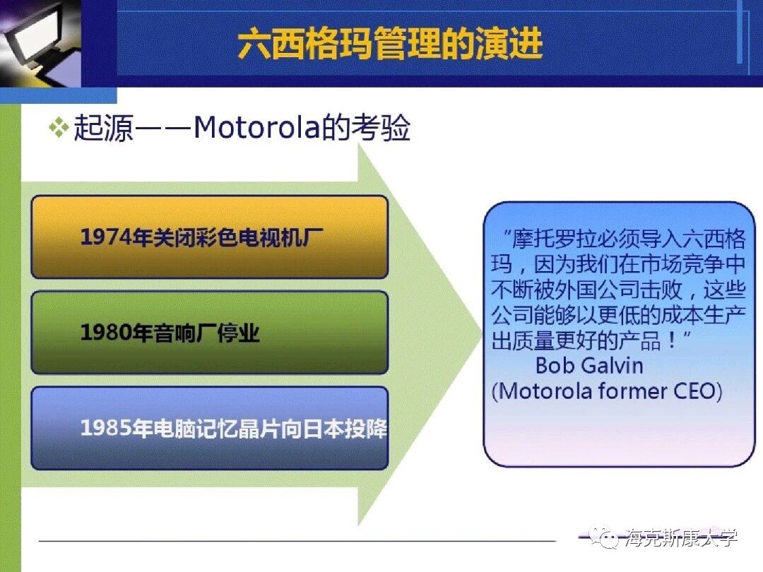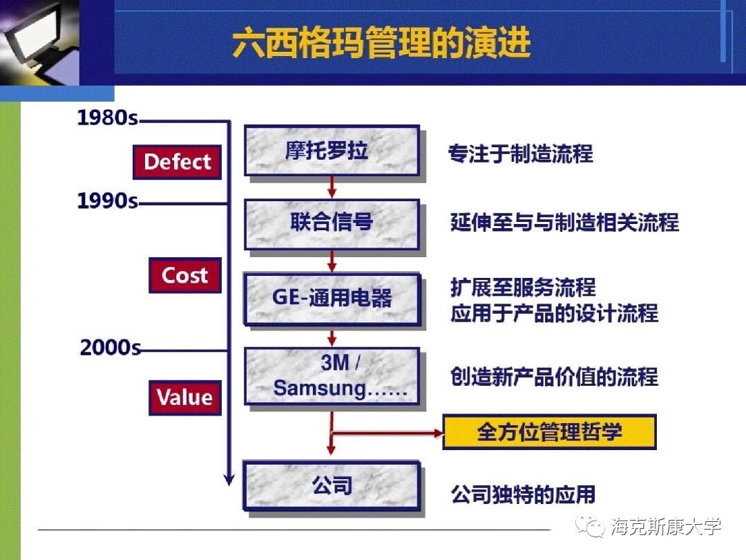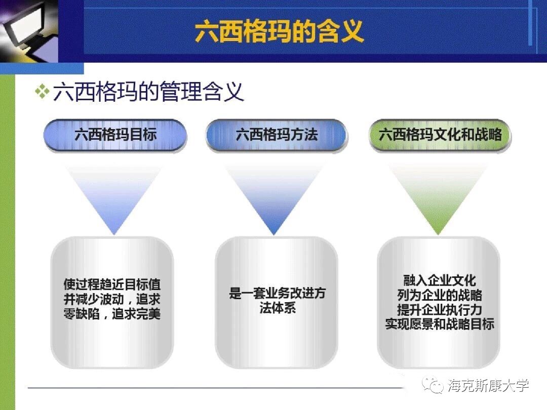 六西格玛逐步发展成为以顾客为主体来确定企业战略目标和产品开发设计的标尺,追求持续进步的一种管理哲学。