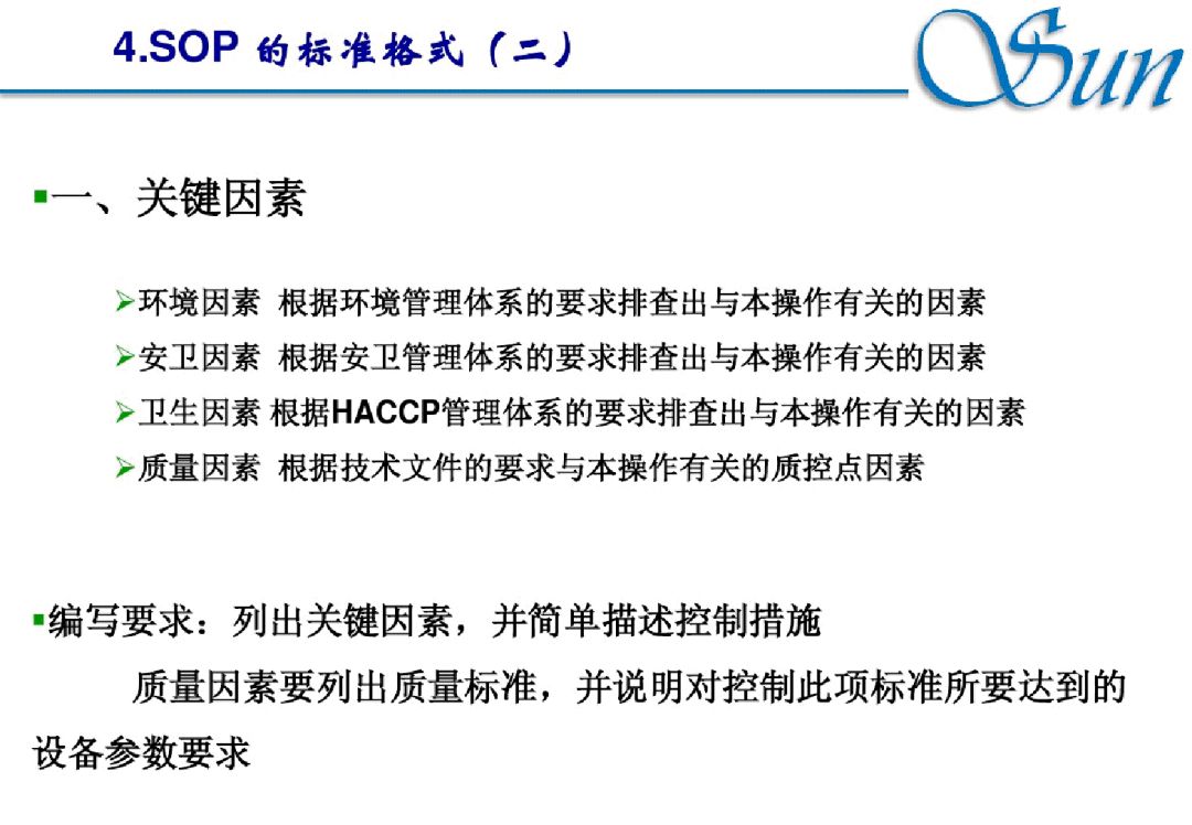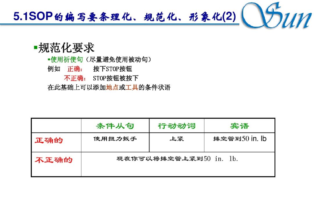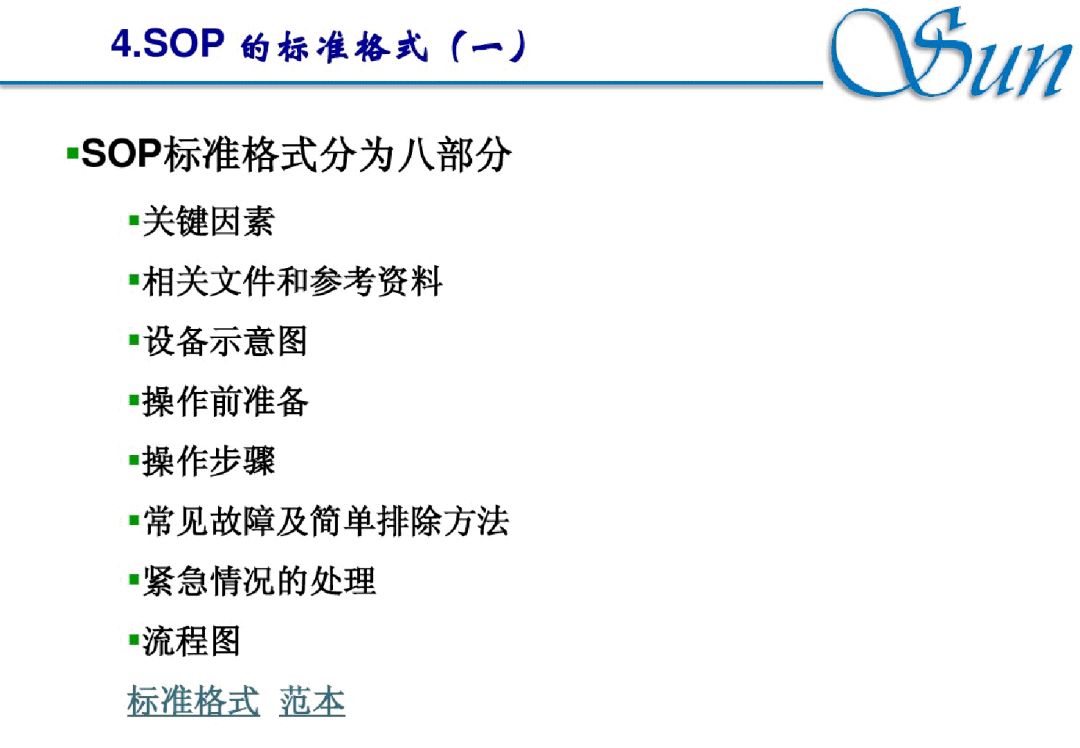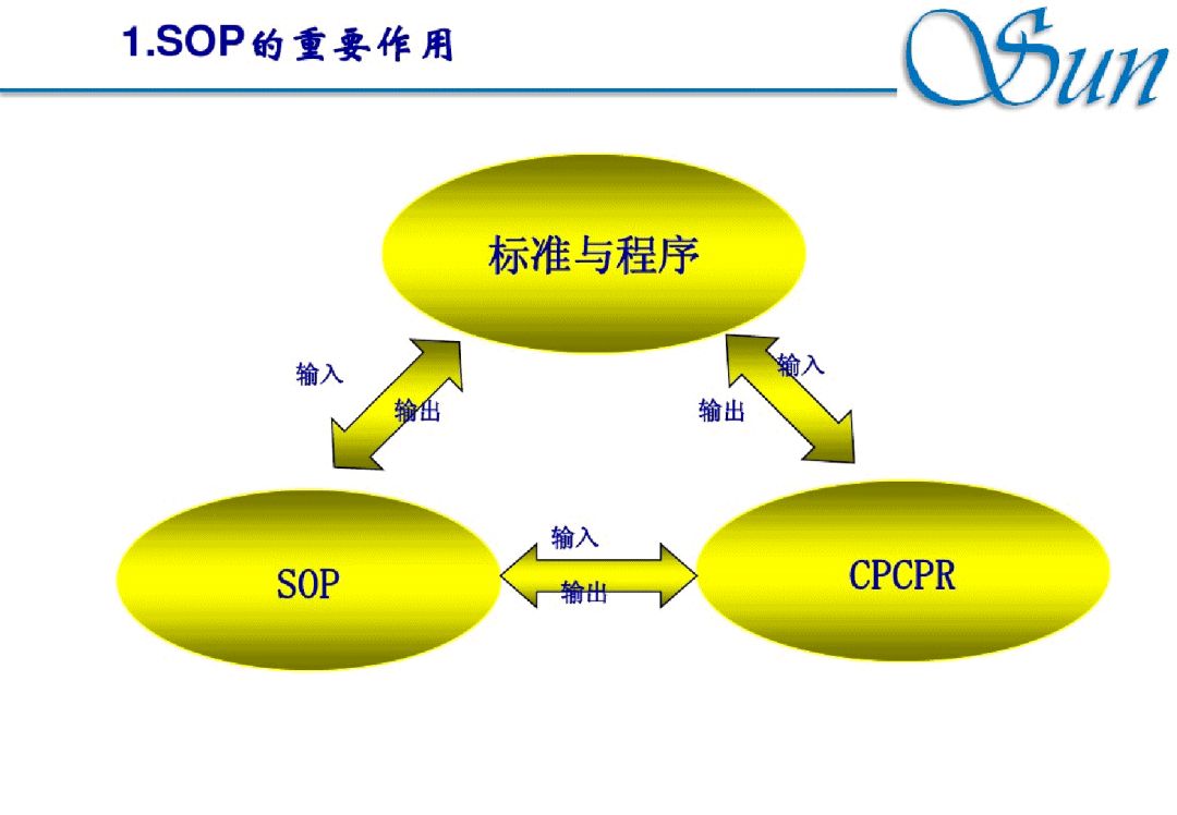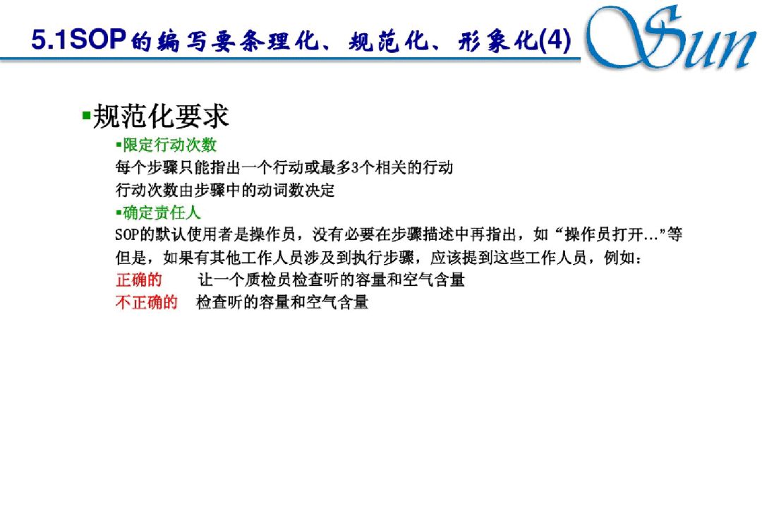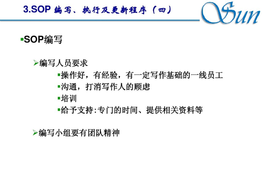 ①技术储备 ② 提高效率 ③ 防止再发 1、将企业积累下来的技术﹑经验记录在标准文件中,以免因技术人员的流动而使技术流失; 2、使操作人员经过短期培训,快速掌握较为先进合 理的操作技术; 3、根据作业标准,易于追查不良品产生的原因; 4、树立良好的生产形象,取得客户信赖与满意; 5、实现生产管理规范化、生产流程条理化、标准化、形象化、简单化; 6、是企业最基本﹑最有效的管理工具和技术资料。 ● SOP是一种程序 SOP是对一个过程的描述,不是一个结果的描述。同时,SOP不是制度,也不是表单,是流程下面某个程序中关控制点如何来规范的程序。 ● SOP是一种作业程序 SOP首是一种操作层面的程序,是具体可操作的,不是理念层次上的东西。如果结合ISO9000体系的标准,SOP是属于三阶文件,即作业性文件。 所谓标准,有最优化的概念,即不是随便写出来的操作程序都可以称做SOP,而一定是经过不断实践总结出来的,在当前条件下可以实现的最优化的操作程序设计。 说得更通俗一些,所谓的标准,就是尽可能地将相关操作步骤进行细化、量化和优化,细化、量化和优化的度就是在正常条件下大家都能理解又不会产生歧义。 ● SOP不是单个的,是一个体系 虽然我们可以单独地定义每一个SOP,但真正从企业管理来看,SOP不可能只是单个的,必然是一个整体和体系,也是企业不可或缺的,而且这个标准作业程序一定是要做到细化和量化。 举例说明: ① SOP编写流程: ② SOP编写计划书:明确SOP的编号、工序名称、编写人、初稿完成时间、小组讨论时间及最终的定稿时间。 ① 编写总要求: 条理化,规范化,形象化 逻辑性 正确性,精确性 可操作性 ② SOP的编写要条理化、规范化、形象化: 语句和结构 条理清晰 文章前后有关联,指向分明 SOP精彩PPT资料 免责声明:本文源于网络,版权归原作者所有。如涉及版权,请联系删除。