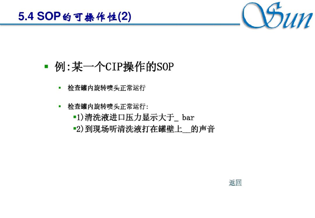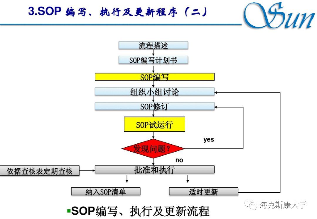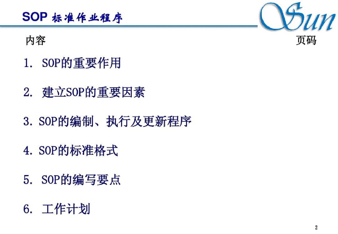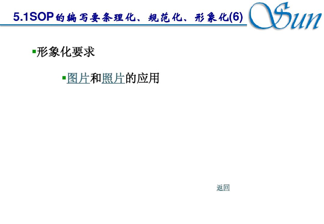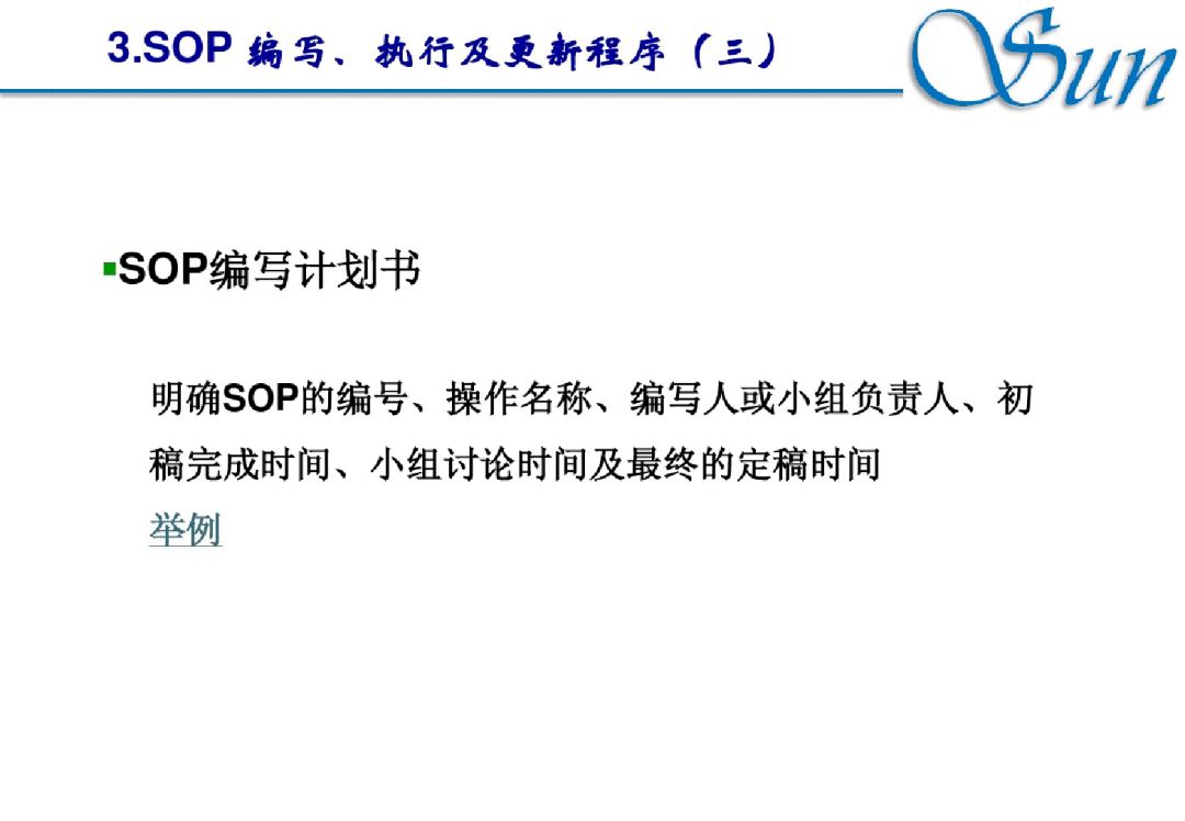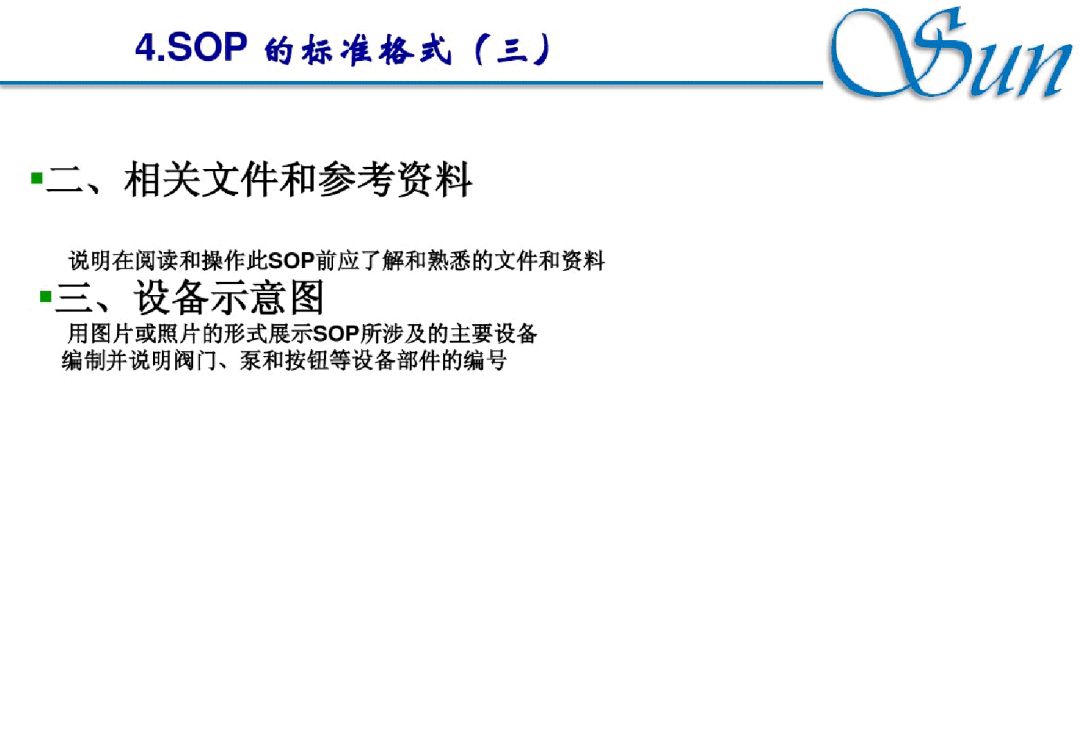 ①技术储备 ② 提高效率 ③ 防止再发 1、将企业积累下来的技术﹑经验记录在标准文件中,以免因技术人员的流动而使技术流失; 2、使操作人员经过短期培训,快速掌握较为先进合 理的操作技术; 3、根据作业标准,易于追查不良品产生的原因; 4、树立良好的生产形象,取得客户信赖与满意; 5、实现生产管理规范化、生产流程条理化、标准化、形象化、简单化; 6、是企业最基本﹑最有效的管理工具和技术资料。 ● SOP是一种程序 SOP是对一个过程的描述,不是一个结果的描述。同时,SOP不是制度,也不是表单,是流程下面某个程序中关控制点如何来规范的程序。 ● SOP是一种作业程序 SOP首是一种操作层面的程序,是具体可操作的,不是理念层次上的东西。如果结合ISO9000体系的标准,SOP是属于三阶文件,即作业性文件。 所谓标准,有最优化的概念,即不是随便写出来的操作程序都可以称做SOP,而一定是经过不断实践总结出来的,在当前条件下可以实现的最优化的操作程序设计。 说得更通俗一些,所谓的标准,就是尽可能地将相关操作步骤进行细化、量化和优化,细化、量化和优化的度就是在正常条件下大家都能理解又不会产生歧义。 ● SOP不是单个的,是一个体系 虽然我们可以单独地定义每一个SOP,但真正从企业管理来看,SOP不可能只是单个的,必然是一个整体和体系,也是企业不可或缺的,而且这个标准作业程序一定是要做到细化和量化。 举例说明: ① SOP编写流程: ② SOP编写计划书:明确SOP的编号、工序名称、编写人、初稿完成时间、小组讨论时间及最终的定稿时间。 ① 编写总要求: 条理化,规范化,形象化 逻辑性 正确性,精确性 可操作性 ② SOP的编写要条理化、规范化、形象化: 语句和结构 条理清晰 文章前后有关联,指向分明 SOP精彩PPT资料 免责声明:本文源于网络,版权归原作者所有。如涉及版权,请联系删除。