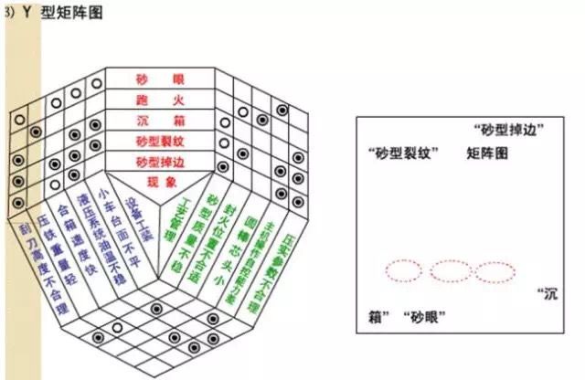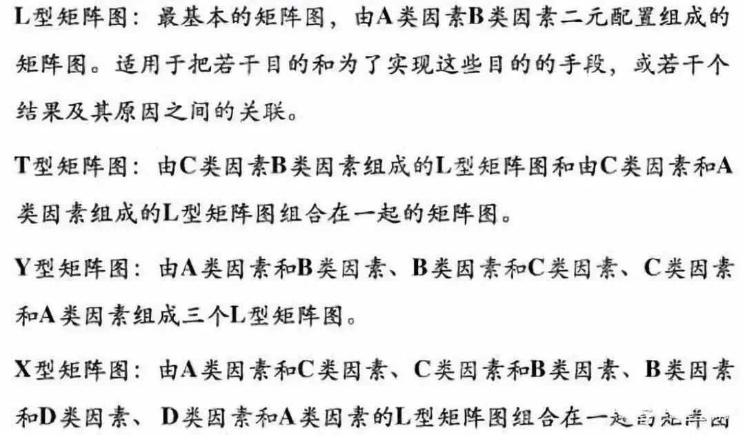 1 什么是质量矩阵 矩阵图法就是从多维问题的事件中,找出成对的因素,排列成矩阵图,然后根据矩阵图来分析问题,确定关键点的方法,它是一种通过多因素综合思考,探索问题的好方法。矩阵图是利用数学上矩阵的形式表示因素间的相互关系,从中探索问题所在并得出解决问题的设想。他是进行多元思考,分析问题的方法。 2 质量矩阵怎么用? 矩阵图法从问题事项中,找出成对的因素群,分别排列成行和列,找出其间行与列的相关性或相关程度的大小的一种方法。在目的或结果都有二个以上,而要找出原因或对策时,用矩阵图比其他图方便。在复杂的质量问题中,往往存在许多成对的质量因素,将这些成对因素找出来,分别排列成行和列,其交点就是其相互关联的程度,在此基础上再找出存在的问题及问题的形态,从而找到解决问题的思路。 3 矩阵图形式有哪些? 4 矩阵图特点是什么? 1.透过矩阵图的制作与使用,可以累积众人的经验,在短时间内整理出问题的头绪或决策的重点,可以发挥象数据般的效果。 2.各种要素之间的关系非常明确,能够使我们掌握到全体要素的关系。 3.矩阵图可根据多次元方式的观察,将潜伏在内的各项因素显示出来。在系统图、关联图、亲和图等手法已分析至极限时使用。 4.矩阵图依行、列要素分析,可避免一边表现得太抽象、而另一边又太详细的情形发生。 5 矩阵图优点是什么? 矩阵图的最大优点在于,寻找对应元素的交点很方便,而且不会遗漏,显示对应元素的关系也很清楚。矩阵图法还具有以下几个特点: ①可用于分析成对的影响因素; ②因素之间的关系清晰明了,便于确定重点; ③便于与系统图结合使用。 6 关于矩阵图的说明 矩阵图着眼于由属于行的要素与属于列的要素所构成之二元素的交点: 1.从二元的分配中探索问题的所在及问题的型态。 2.从元的关系中探求解决问题的构想。 在行与列的展开要素中,要寻求交叉点时,如果能够取得数据,就应依定量方式求出;如果无法取得数据时,则应依经验转换成资讯,再决定之,所以决策交叉点时,以全员讨论方式为之,并能在矩阵图旁注上讨论的成员、时间、地点及数据取得方式等简历,以便使用参考。有时候交叉点的重要度各不相同,因此可用各种记号区别之,例如: ◎ 非常重要或有非常显著关联 ○ 重要或有显著关联 △ 有关联 也可以用文字或数据写在交叉点上,使重要度更明确。 7 矩阵图应用场景 矩阵图应用比较广泛,一般应用在以下几种情况下: 1.竞争对手分析时; 2.新产品策划时; 3.探索新的课题时; 4.方针目标展开时; 5.明确事件关系时; 6.纠正措施排序时。 具体如下: 新产品开发时进行质量功能展开分析; 分析生产不良的原因及其影响因素; 进行多变量分析,以确定影响问题的关键因素; 进行质量改善,以确定解决问题的方法; 进行多因子实验,寻找优化实验结果; 分析产生问题的原因,寻求对策; 寻求改进产品的突破口; 评价产品质量、功能特性,进一步提高产品的可靠性; 分析潜在原因,提高产品质量和合格率; 分析不良原因,以评价质量体系的有效性。 如何制作矩阵图? 制作矩阵图一般要遵循以下几个步骤: ①确定需解决的问题,列出影响因素; ②选择因素群,把成对因素排列成行和列,表示其对应关系,以确定相互关系及其影响; ③选择合适的矩阵图类型,一般两因素群用L型矩阵图,三因素群用T型矩阵图,四因素群用X型矩阵图; ④在成对因素交点处表示其关系程度,一般凭经验进行定性判断,可分为三种:关系密切、关系较密切、关系一般(或可能有关系),并用不同符号表示; ⑤根据关系程度确定必须控制的重点因素; ⑥针对重点因素作对策表。 如上图所示,A为某一个因素群,a1、a2、a3、a4、…是属于A这个因素群的具体因素,将它们排列成行;B为另一个因素群,b1、 b2、b3、b4、…为属于B这个因素群的具体因素,将它们排列成列;行和列的交点表示A和B各因素之间的关系,按照交点上行和列因素是否相关联及其关联程度的大小,可以探索问题的所在和问题的形态,也可以从中得到解决问题的启示等。质量管理中所使用的矩阵图,其成对因素往往是要着重分析的质量问题的两个侧面,如生产过程中出现了不合格时,着重需要分析不合格的现象和不合格的原因之间的关系,为此,需要把所有缺陷形式和造成这些缺陷的原因都罗列出来,逐一分析具体现象与具体原因之间的关系,这些具体现象和具体原因分别构成矩阵图中的行元素和列元素。 8 矩阵图案例 案例是橡胶制品不良与成型及原材料相互影响的L型矩阵图 免责声明:本文源于网络,版权归原作者所有。如涉及版权,请联系删除。
